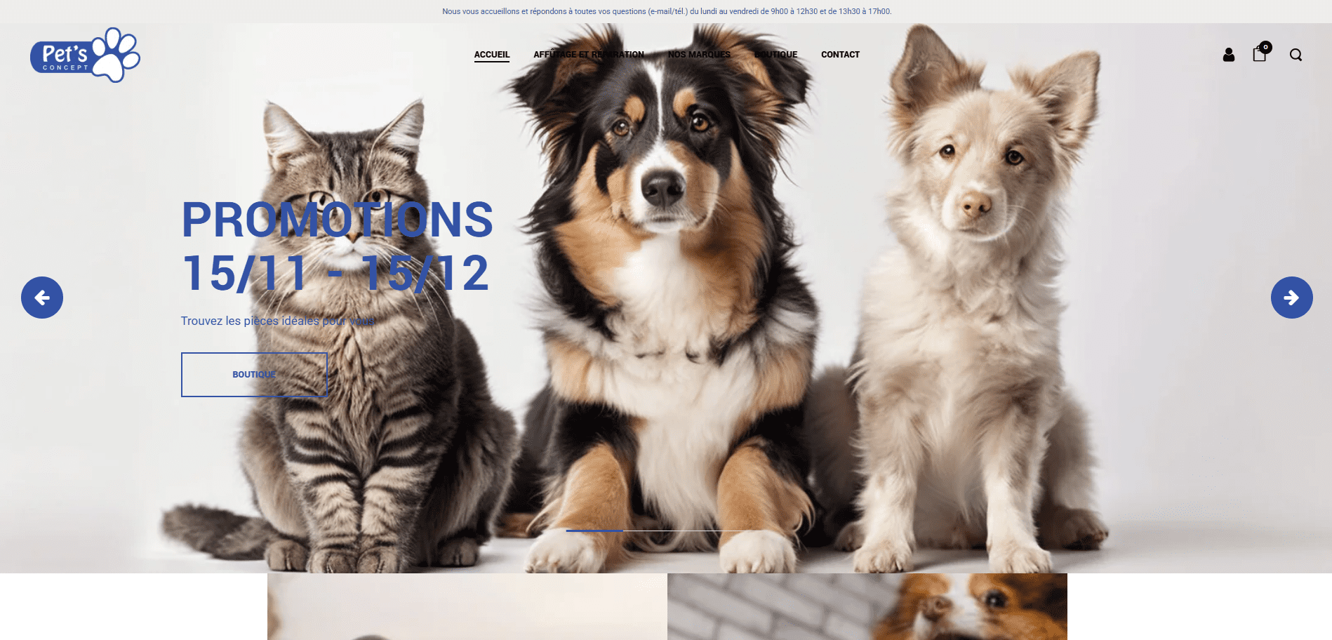 Pets Concept souhaitait moderniser sa présence en ligne avec un site capable de répondre à deux besoins distincts : séduire une clientèle de particuliers tout en offrant une expérience fluide et complète aux professionnels du secteur du toilettage et aux étudiants en formation. L’un des enjeux majeurs consistait à gérer un catalogue très riche de plus de 1 250 références tout en assurant une navigation claire et rapide. Il fallait également valoriser des services complémentaires comme l’aménagement de salons, les offres promotionnelles ou encore le showroom physique situé à Alleur, tout en permettant aux clients professionnels de demander facilement des devis sur mesure.